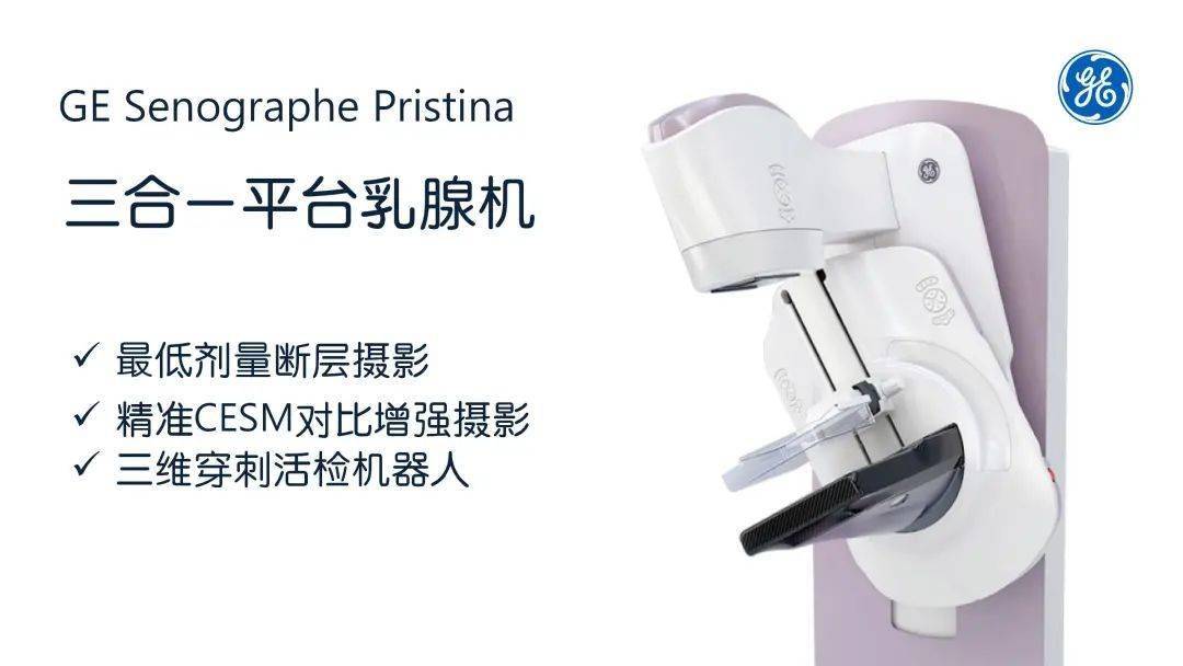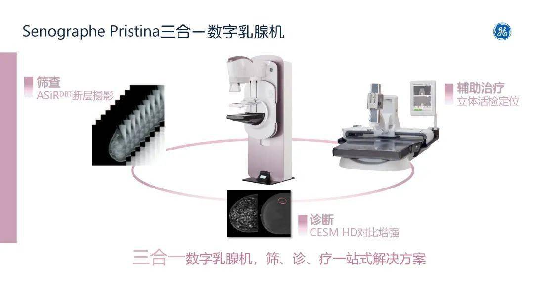 何为三合一?杨念经理介绍, Senographe Pristina创新的将乳腺断层摄影技术、乳腺对比增强技术、立体定位活检技术,合三为一,贯穿乳腺筛查、诊断、治疗全路径,为乳腺癌早期发现、早期诊断以及治疗和术后监控全流程带来了完整解决方案。乳腺断层摄影即一次检查可以获得多张不同角度的影像,重建出乳腺的三维立体图像,可以观察到病灶在不同位置的情况;乳腺高清对比增强技术,特异性诊断方面更强,可以帮助医生检出病灶的位置、大小和形态,有效帮助降低假阳性率,从而提高检出率,最大程度的减少遗漏。立体定位活检可以实现四轴全自动定位,有效帮助临床实现灵活、精准的活检穿刺定位、多病灶精准定位。创新技术三合一,让乳腺机在乳腺疾病的筛查、精准诊断、活检定位等临床常规流程中发挥更大的价值。