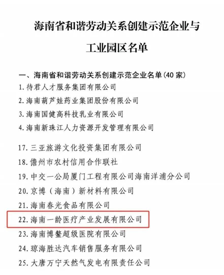 其中,博鳌乐城国际医疗旅游先行区荣获“海南省和谐劳动关系创建示范工业园区”称号,海南一龄医疗产业发展有限公司荣获“海南省和谐劳动关系创建示范企业”称号!