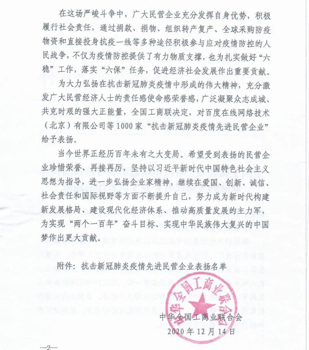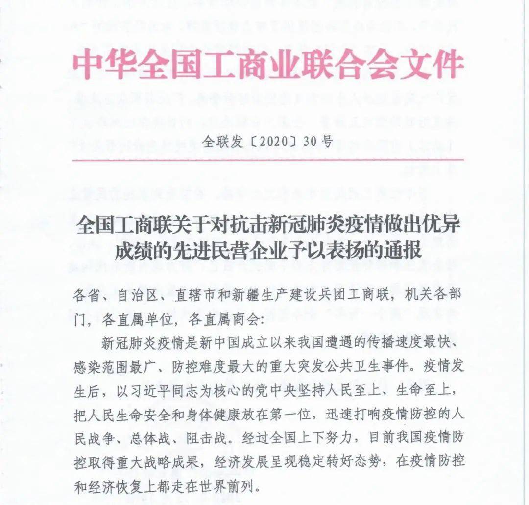 近期,全国工商联发出《全国工商联关于对抗击新冠肺炎疫情做出优异成绩的先进民营企业予以表扬的通报》,对在疫情期间为积极履行社会责任,通过捐款、捐物、组织转产复产等多种途径积极参与应对疫情防控的国内1000家民营企业给予表扬。一龄医院管理集团因在抗击疫情期间的积极行动亦被列入表扬名单之中。