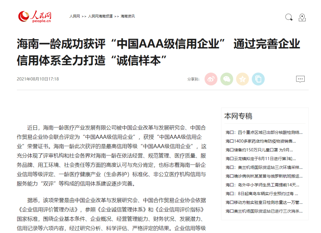 近日,海南一龄医疗产业发展有限公司被中国企业改革与发展研究会、中国合作贸易企业协会联合评定为“中国AAA级信用企业”,获授“中国AAA级信用企业”荣誉证书。海南一龄此次获评的是最高信用等级“中国AAA级信用企业”,这充分体现了评审机构和社会各界对海南一龄在依法经营、规范管理、医疗质量、服务品牌、用工环境、社会责任等方面的高度认可与充分肯定,也标志着海南一龄企业信用等级评定、一龄医疗健康产业(生命养护)标准化、非公立医疗机构信用与服务能力“双评”等构成的信用体系建设逐步完善。