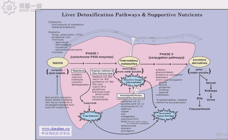 你们知道肝脏主要功能是解毒吗?肝脏解毒主要分俩个板块,分别是一期解毒和二期解毒。肝脏解毒主要是P450酶,体内一些不溶于水的毒素解开,经过一期解毒变成可溶于水毒素,这个时期我们体内的毒素增加了。如果肝脏只进行一期解毒的话毒性就会增加,所以必须进行二期解毒。第二期解毒参与使用很多维生素B族,比如说一些矿如物质:镁、钙、锌元素等等。