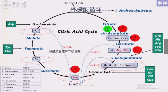 柠檬酸循环中需要维生素B族量很大,维生素B族对我们的机体代谢特别重要。但是维生素B族的吸收因人而异,所以并不是所有人吃蔬菜、水果、绿色植物很好的吸收进去。因为自然界当中有些植物维生素含量比较低,还有就是食物当中吸收度比较差。所以需要补充B族维生素直接去补充维生素B族补充剂,相对自然界的量来说更好些。维生素B族含有B1、B2、B3 、B4、 B5 、B6、 B9 、B12等等.