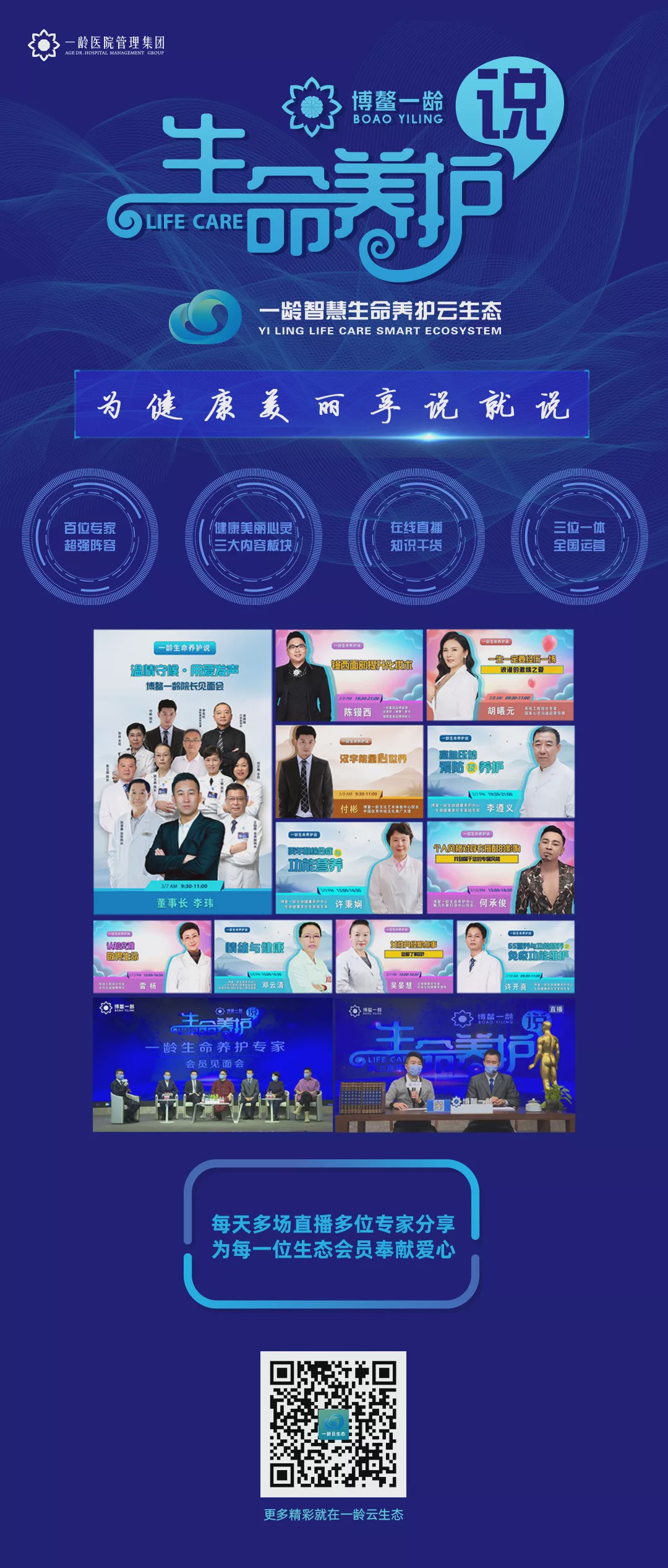 《一龄生命养护说》是一龄集团互联网创新产业战略项目“一龄智慧生命养护云生态”的核心模块之一。依托一龄集团十六年专业专家团队和丰富的生命养护经验,通过一龄APP以及更多的新媒体平台,以移动互联网在线直播、专题内容等形式传播。